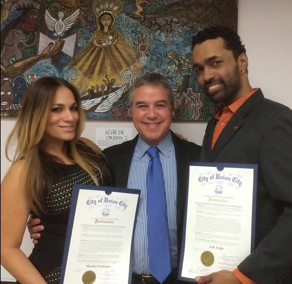 A.B. Lugo was selected as Distinguished Puerto Rican Man of the Year by the Mayor of Union City, New Jersey (and New Jersey State Senator) Brian P. Stack and the Union City Board of Commissioners (Lucio Fernández, Maryury A. Martinetti, Tilo E. Rivas, and Celín Valdivia) for his achievements as an actor, writer, director, producer, and arts administrator and advocate. Television host and entrepreneur Mariluz Fontañez was selected as Distinguished Puerto Rican Woman of the Year. [Shown at right, from left to right: Fontañez, Fernández, Lugo.]
